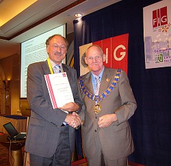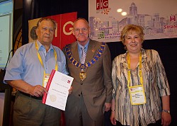 Prof. Bela Markus receives his FIG badge from President Enemark. |