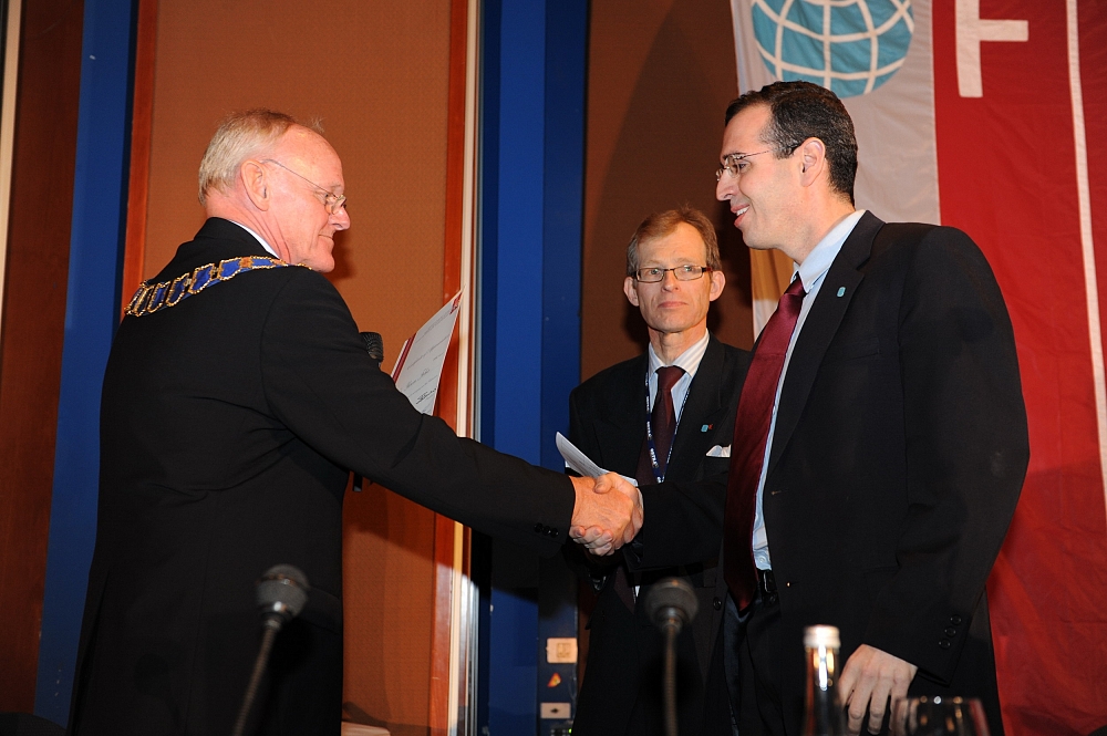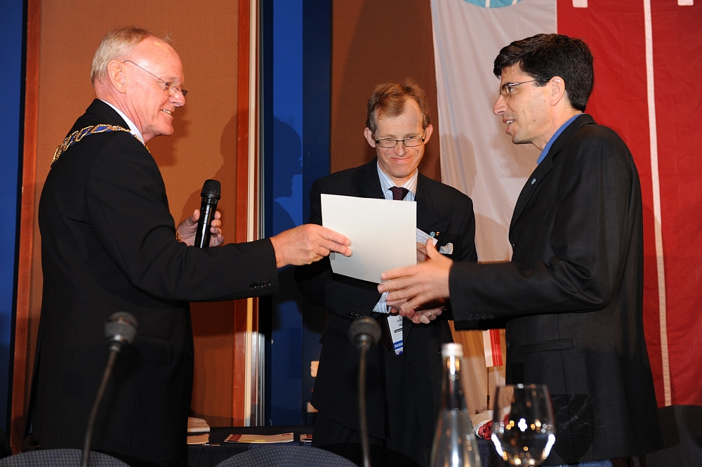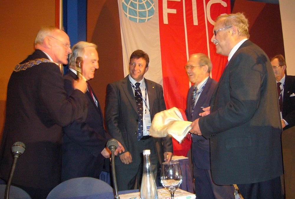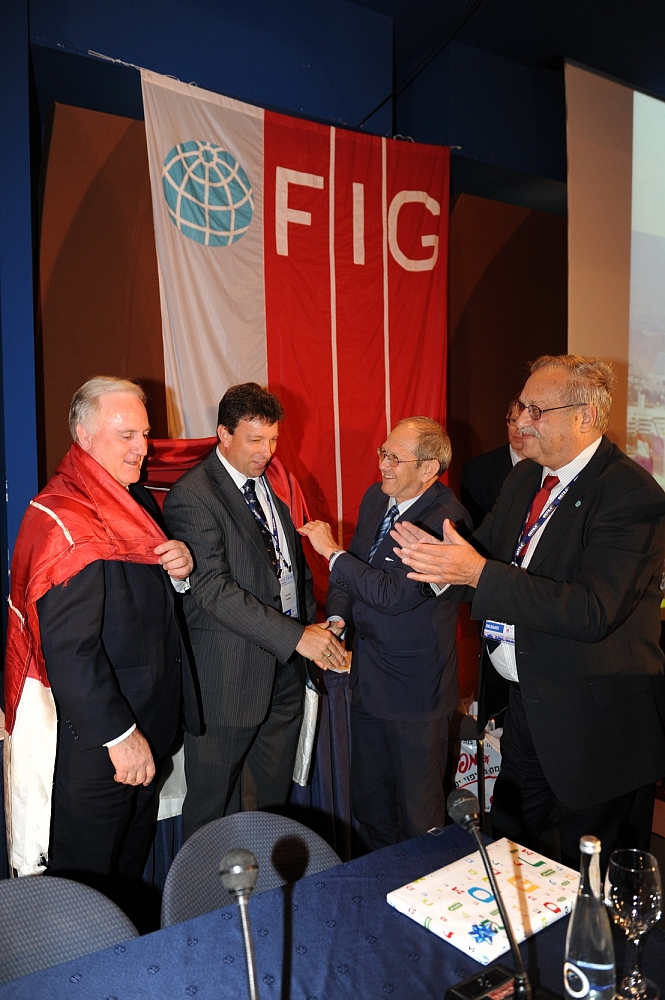 Stig Enemark, Warwick Watkins and Craig Sandy receiving the FIG flag from Haim Srebro and Joseph Kraus.