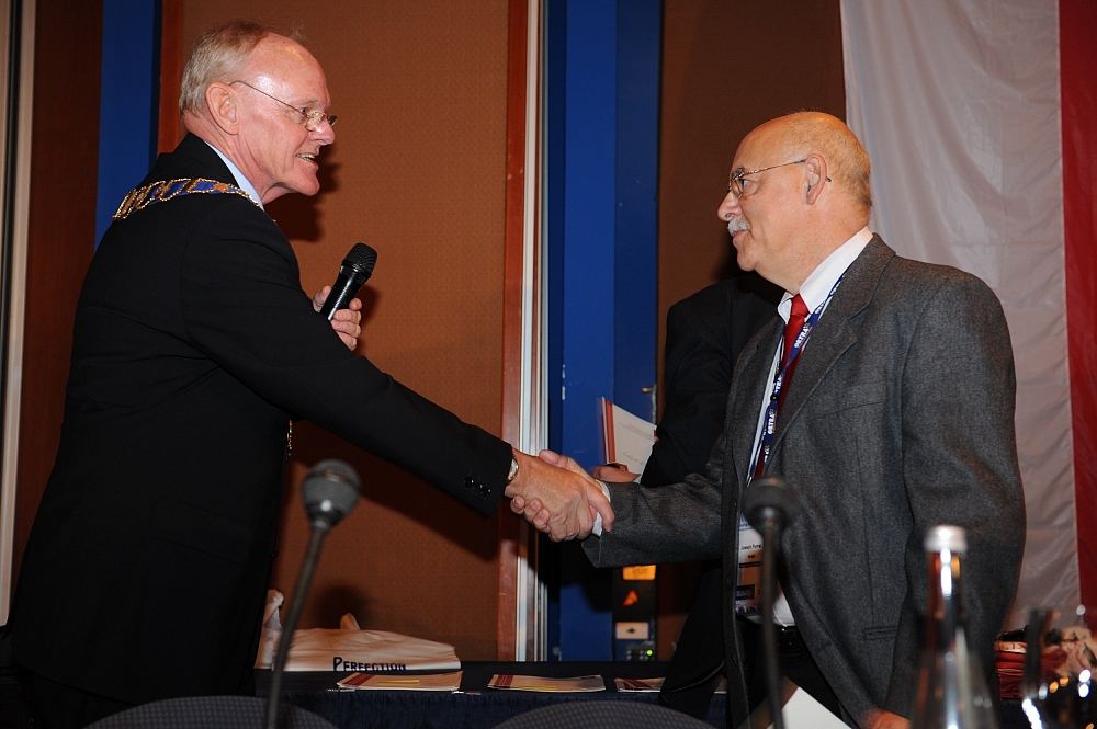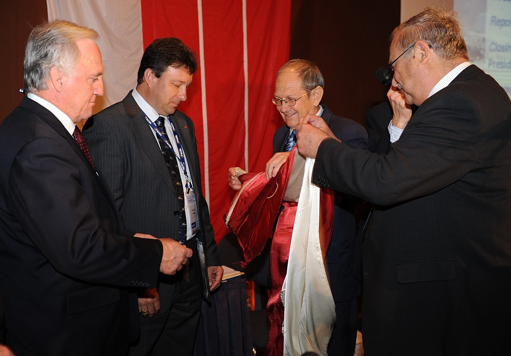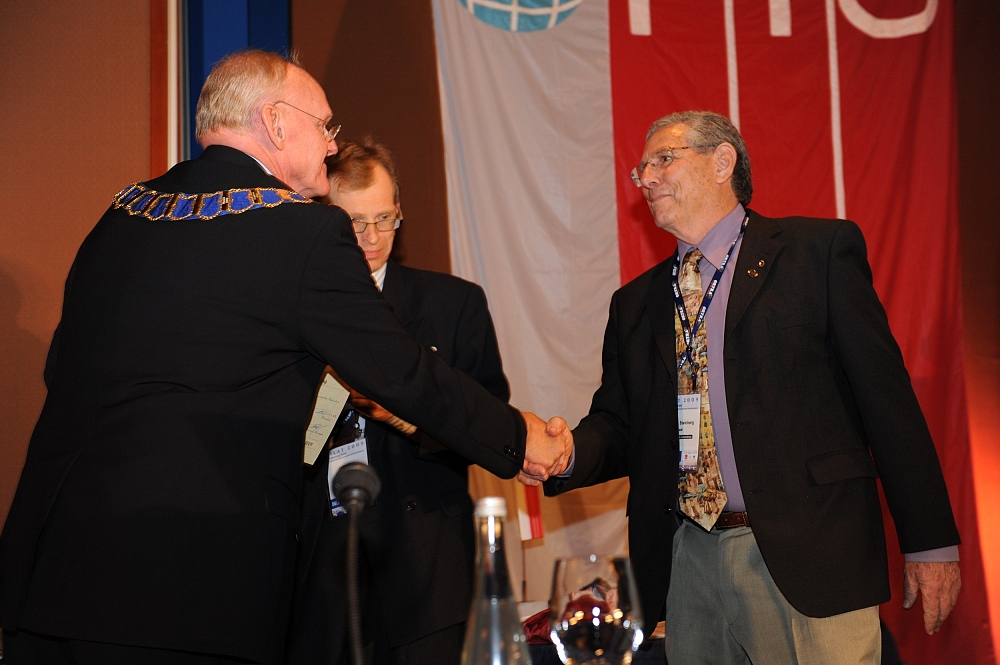 Warwick Watkins and Craig Sandy receiving the FIG flag from Haim Srebro and Joseph Kraus.