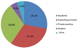 50 percent of the respondents come from Europe and 25 percent from Africa. This correlates well with the characteristic of the attendees at the Working Week. It is interesting to note that the respondents are equally divided between academic, public and private sector. This matches the overall number of participants.
