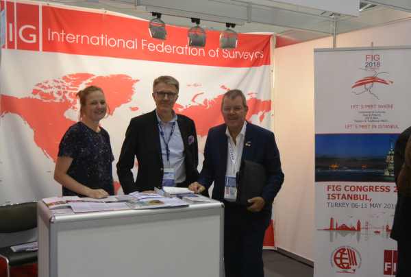 Claudia Stormoen, FIG Office, Pekka Halme, Co-Conference Director for the Working Week 2017 in Helsinki, Finland and Henning Elmstrom from Denmark at the FIG stand.