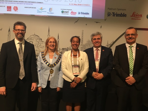FIG Council during FIG Congress 2018. From left Mikael Lilje (Sweden) Chryssy Potsiou (Greece), Diane Dumashie (United Kingdom), Orhan Ercan (Turkey - also Co-Congress Director) and Rudolf Staiger (Germany)