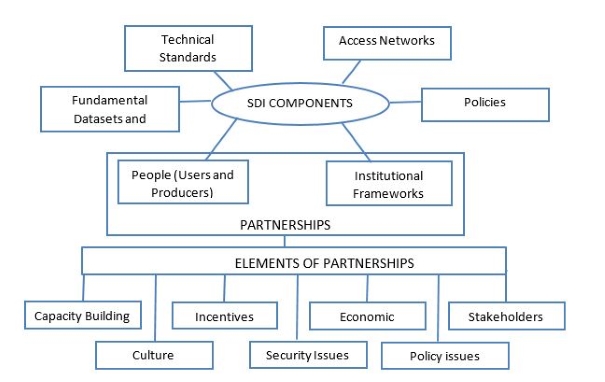 The illustration in figure 1 is meant to reveal that SDI partnerships can be premised on two SDI components, namely people and institutional frameworks as a linkage between other SDI components and various elements of system development. In that case, figure 1 highlight the importance of partnerships in building SDIs whereby roles could be identified in which stakeholders can partake for a successful SDI initiative.
