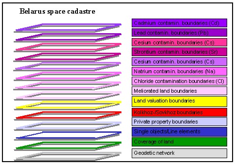 The implementation of the private land property in Belarus demanded a new cadastre system. In view of the needs for reliable data on land, in particular in the zones where heavy environmental damages have been caused by the Chernobyl disaster on one hand and by industrial pollution on the other hand, the cadastre was designed to be able to document other land objects than only the private property parcels. Figure 9 shows the structure and contents of the Belarus spatial cadastre.