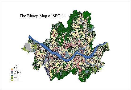 The land cover and Biotop survey using the GIS and remote sensing technique is conducted by Seoul Metropolitan Government (SMG) recently. The Biotop survey data will be very useful for the sustainable urban planning and management, urban ecosystem conservation and restoration, etc. SMG will periodically produce the Biotop map that shows the current ecological status of Seoul. Below figure is the Seoul's Biotop Map (from http://green.metro.seoul.kr/). These kinds of study and survey are using the more area-wide land use information. So, they are more appropriate for the macro-level and 2-dimensional analysis. But, the future city will be more compact, high-rise and will have higher density structure than now. Such city's sustainable development and management will be possible by the continuous monitoring of urban infrastructure's carrying capacity. By the construction of EULIS that contains parcel, building and user's traffic and environmental characteristics, the sustainable, micro-level, scientific and efficient urban management will be possible.