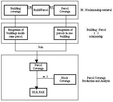 The FAR which implies the density of urban development can be calculated and shown with this system. <Fig. 1> is the flowchart for BLR and FAR. <Fig. 2> and <Fig. 2> are the result maps of BLR and FAR each. Those information can be utilized in the designation of redevelopment area and detailed area planning (such as Germany's B-planning).