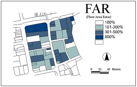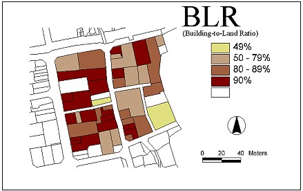 • The suitability of zoning and development potential by parcel can be evaluated by the Building-to-Land Ratio (BLR) and Floor Area Ratio (FAR) by buildings or blocks.(Lee, Yangjae and Junehwan Koh, 1997)