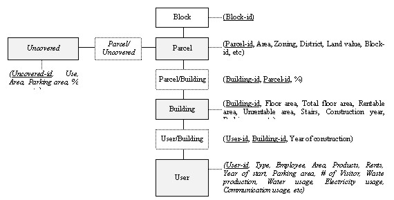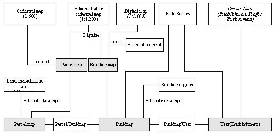 The data collection system of the ULUIS Model is as follows: (1) the digitizing of the building's footprints from the aerial map (1:1,200 scale) and the parcel boundary from cadastral map, (2) the input of attribute data, such as address, area, land value and owner from land register, use, year of built, number of stairs from building register, classification by industry, total floor area and number of employees from establishment register, (3) the field survey for parking lot, open space, etc.